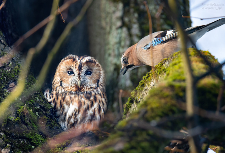 «Сегодня наблюдал диалог между совой и сойкой. Сойка явно была чем-то недовольна, а сова ей в ответ ничего не отвечала, наверное, думала про себя: "Есть такие птицы, которые вечно всем недовольны...» - шутливо прокомментировал автор фото.