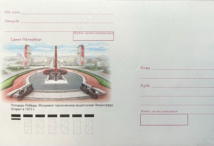 На конверте, выпущенном тиражом 50 000 экземпляров, изображена фотография Монумента и нанесена надпись: «Площадь Победы. Монумент героическим защитникам Ленинграда. Открыт в 1975 году». Конверты уже поступили в почтовые отделения Санкт-Петербурга и Ленинградской области.