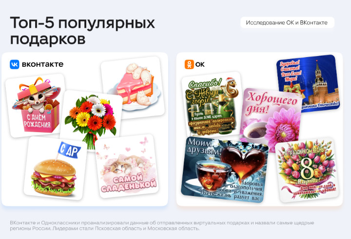 ВКонтакте и Одноклассники проанализировали данные об отправленных виртуальных подарках и назвали самые щедрые регионы России. Лидерами стали Псковская область и Московская область.