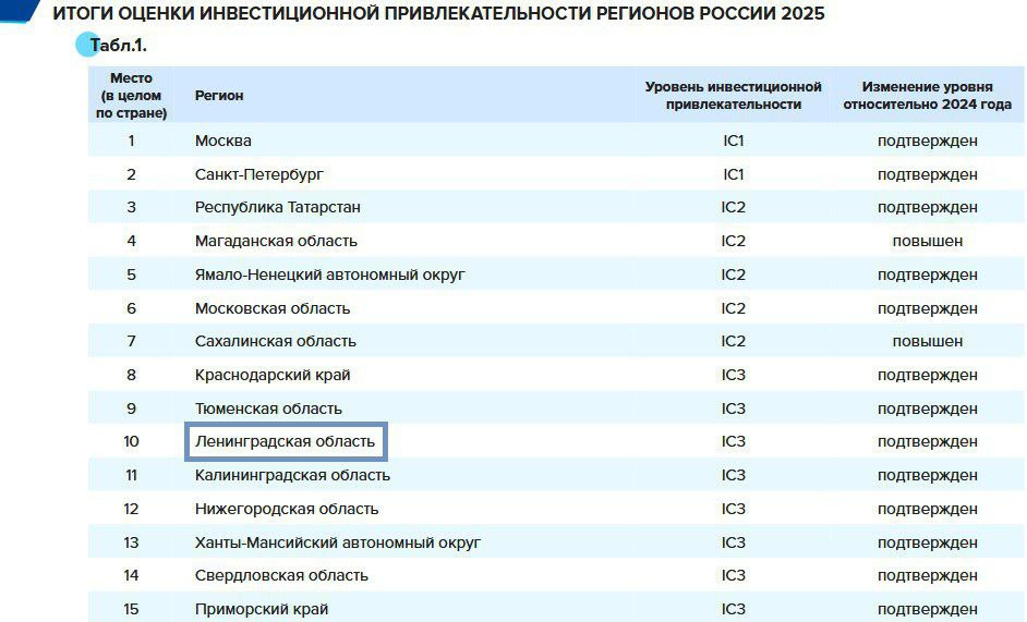 Ленобласть вошла в топ-10 ежегодного рейтинга инвестиционной привлекательности регионов России. Его составило «Национальное рейтинговое агентство». Оценки 2025 года были рассчитаны на основе базы данных НРА, включающей итоговые статистические показатели за 2024 год. Ленобласть заняла десятое место.