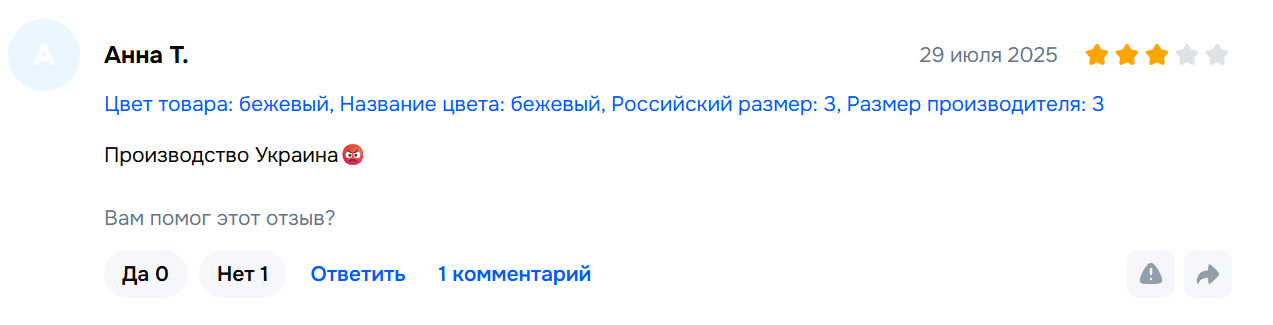 Впрочем, иногда среди сотен товаров все-таки можно встретить возмущенный комментарий какого-нибудь пользователя, которому не понравился факт финансирования украинских организаций. Например, пользователь с никнеймом Ольга Н. выразила негодование в связи с продажей детских товаров с флагом Украины в 2025 году.