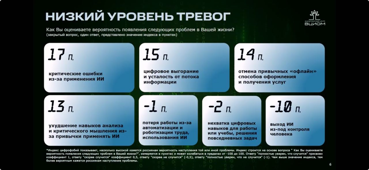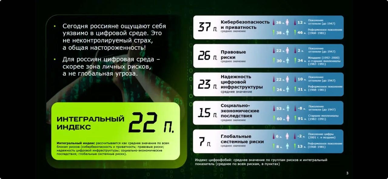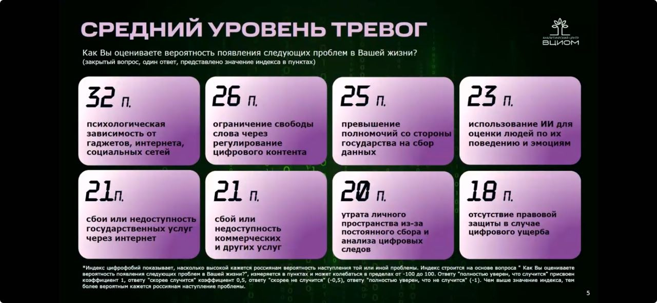 Также спикер представил таблицы с пунктами, относящимися к среднему и низкому уровням тревоги. В него вошли, в частности, «психологическое зависимость от гаджетов, интернета и соцсетей» (32 п.), «ограничение свободы слова через регулирование цифрового контента» (26 п.) и «превышение полномочий со стороны государства на сбор данных» (25 п.).