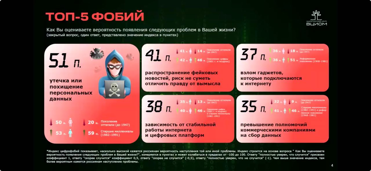 Как сразу отметили участники мероприятия — это первый подход к индексированию цифрофобий россиян. Его реализовали путем проведения опроса по телефону среди 1,6 тысячи совершеннолетних респондентов в разных регионах страны. Классический подход ВЦИОМ (Всероссийского центра изучения общественного мнения).