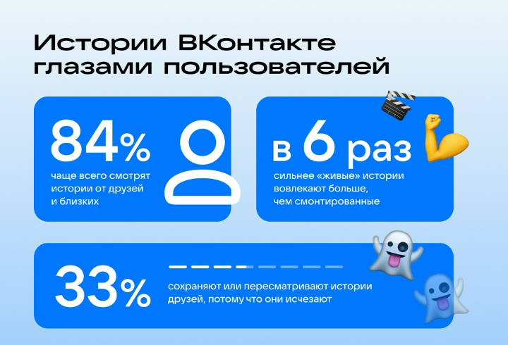 Согласно исследованию, проведенному социальной сетью ВКонтакте, пользователи гораздо сильнее ценят в историях искренность и живую подачу, нежели профессиональный монтаж. Такие публикации вовлекают аудиторию в шесть раз эффективнее. При этом истории от друзей и близких смотрят значительно чаще (84%), а блогеры и сообщества остаются востребованным источником полезной информации, особенно в отношении обзоров и советов по продуктам и сервисам (54%). Любимые форматы – простые и спонтанные (52%), смешные и легкие (41%), а также лайфхаки и обзоры (33%). Молодая аудитория также ценит эстетичные и визуально проработанные истории.