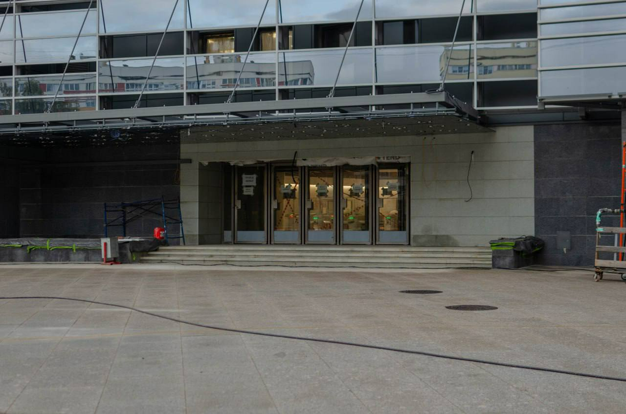На площади перед входом выполнена основная часть работ по укладке плит из натурального камня, и уложена тротуарная плитка на пешеходных дорожках, ведущих от остановок общественного транспорта со стороны проспекта Маршала Жукова к вестибюлю.