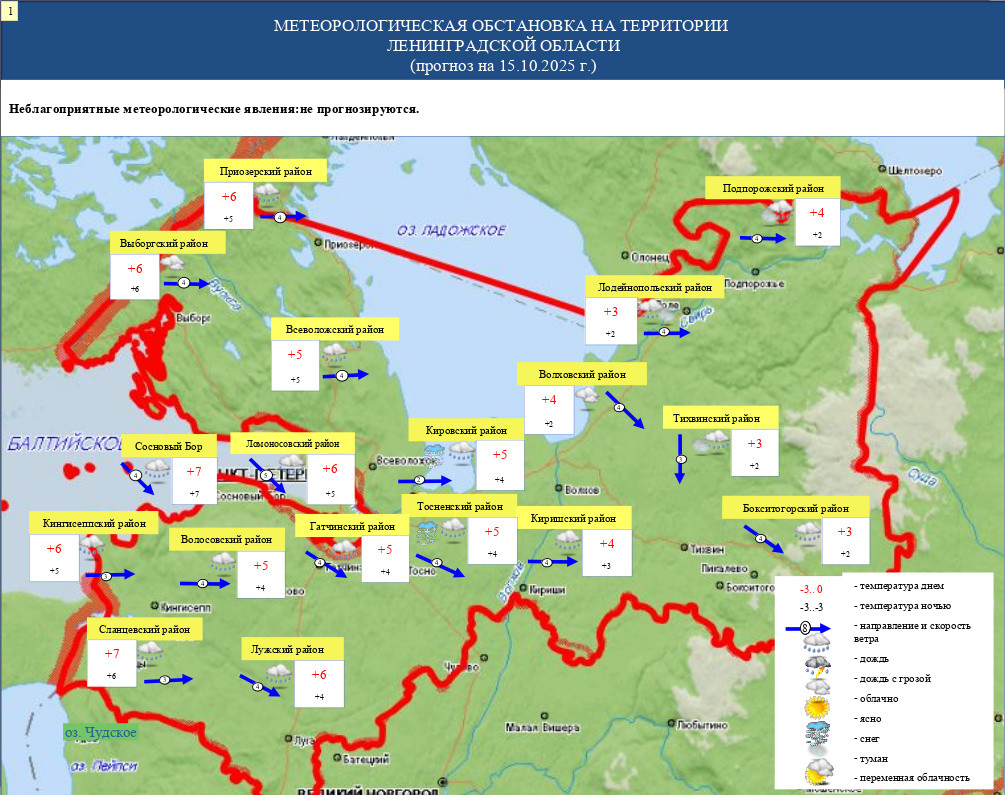 В среду, 15 октября, в Ленобласти будет преимущественно облачно, с прояснениями, сообщает ФГБУ «Северо-Западное УГМС». Ночью в большинстве районов обещают дожди, от слабых до умеренных, а на востоке осадки могут быть в виде дождя с мокрым снегом. Днем погода останется дождливой, но осадки будут несильными.