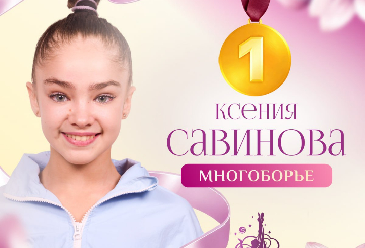 Ксения Савинова из Ленинградской области, представляющая академию художественной гимнастики «Небесная грация» Алины Кабаевой, заняла первое место в многоборье на «Кубке сильнейших» по программе юниорок.