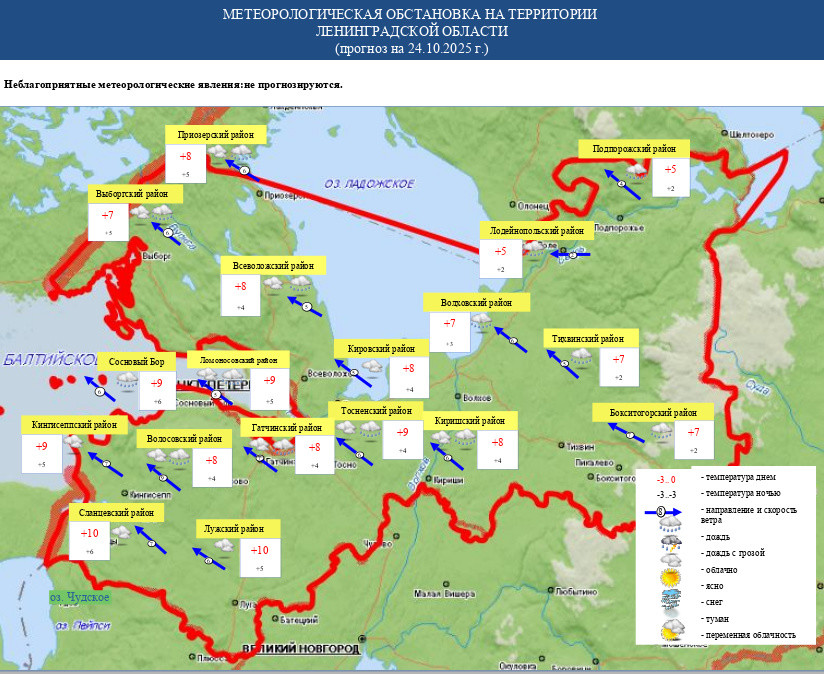 В пятницу, 24 октября, в Ленинградской области ожидается облачная, днем с прояснениями погода. Ночью и в начале дня в большинстве районов Ленобласти пройдет небольшой, местами умеренный дождь. Днем местами также ожидается умеренный дождь.