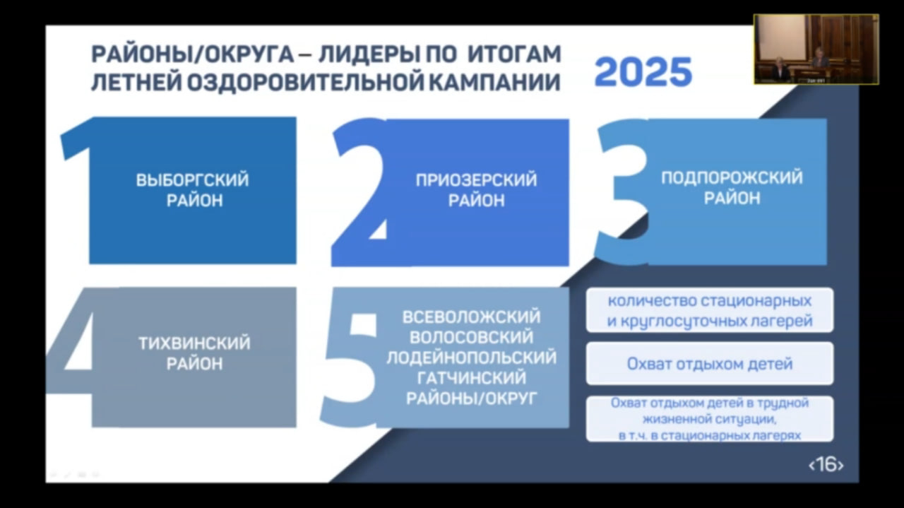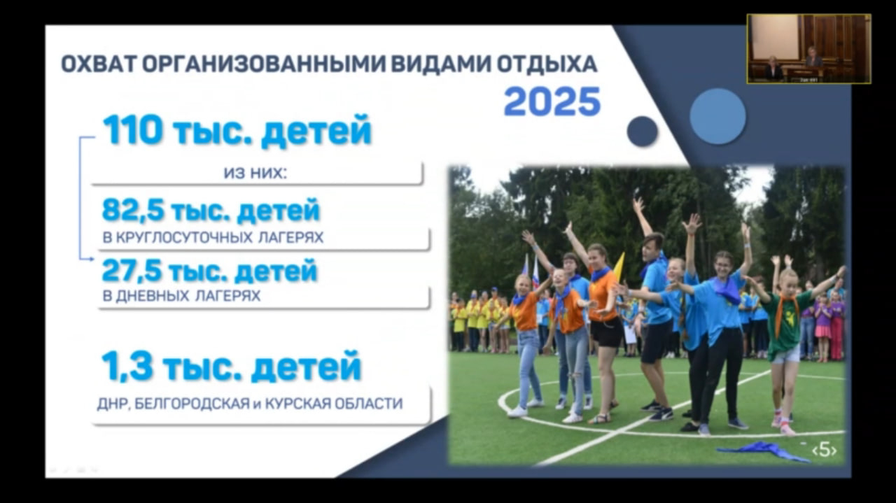 В 2025 году на организацию отдыха и оздоровления детей из бюджетов всех уровней было выделено 1,07 млн рублей. Всего на летнем отдыхе в текущем году побывало 110 тысяч детей. При этом, 21 тысяча из них – те, кто находятся в трудной жизненной ситуации. Приоритет при предоставлении бесплатных путевок отдавался детям, которые состоят на различных видах учета, и детям участников СВО.