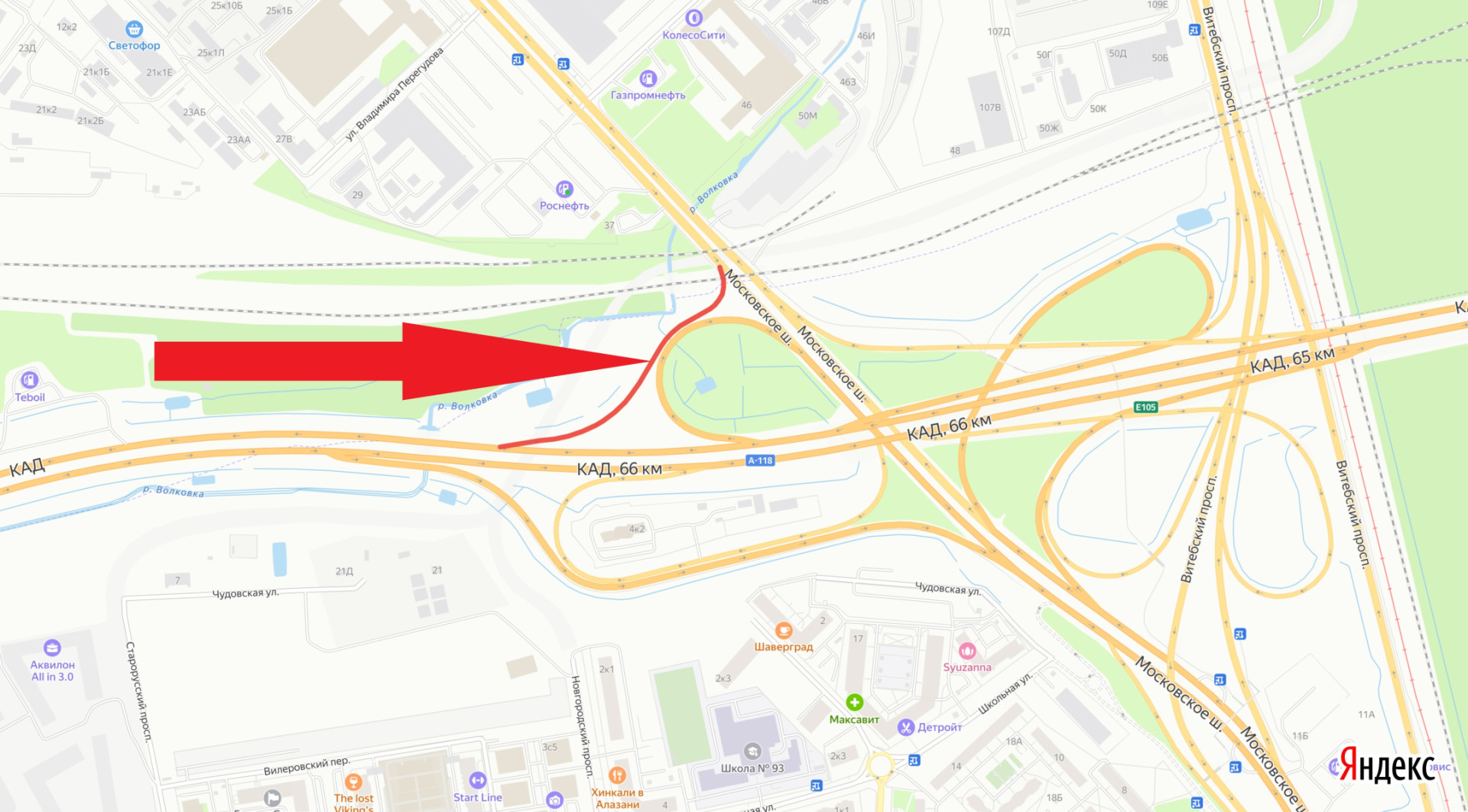 В Петербурге на Кольцевой автодороге на развязке с Московским шоссе полностью перекроют съезд по направлению от станции метро «Звездная» на внутреннее кольцо КАД.