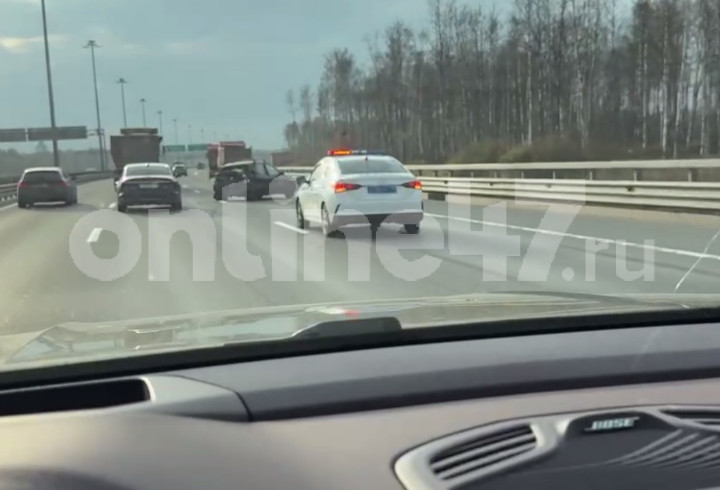 На кадрах, попавших в распоряжение Online47, можно увидеть, как ДТП спровоцировало временные трудности для движения: на одной из полос стоят разбитая легковушка и полицейский автомобиль, а на другой - фура мигает «аварийкой».