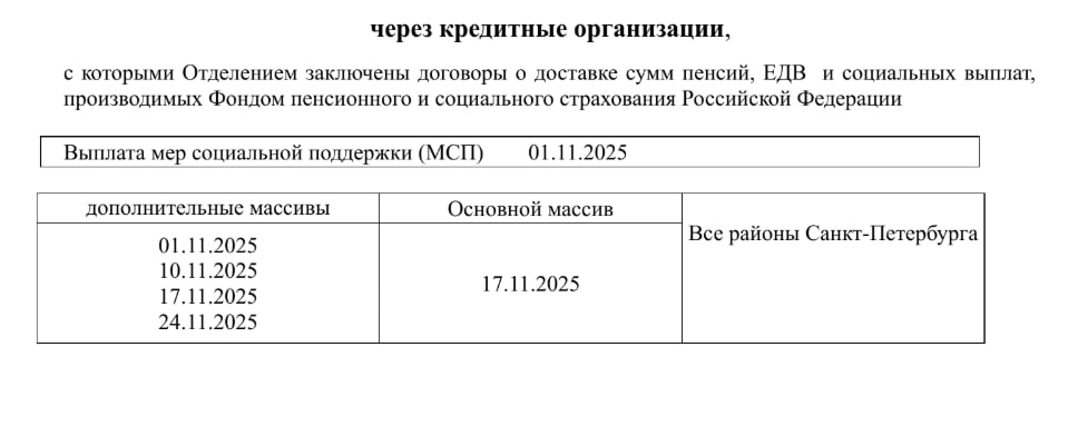 При доставке пенсии через организацию почтовой связи каждому пенсионеру устанавливается дата получения пенсии в соответствии с графиком доставки пенсии. Что касается кредитных организаций, то с 1 октября 2025 года они осуществляют доставку выплат в единую дату - 17 числа ежемесячно. В случае, если 17 число приходится на выходной или праздничный день, доставка пенсии будет произведена в предшествующий рабочий день.