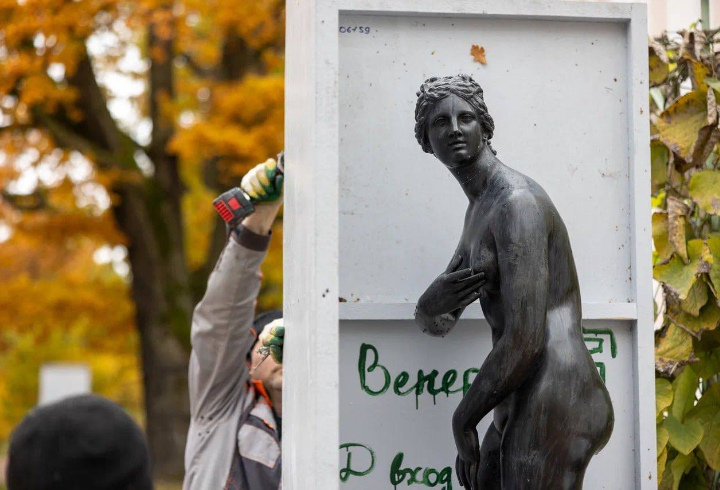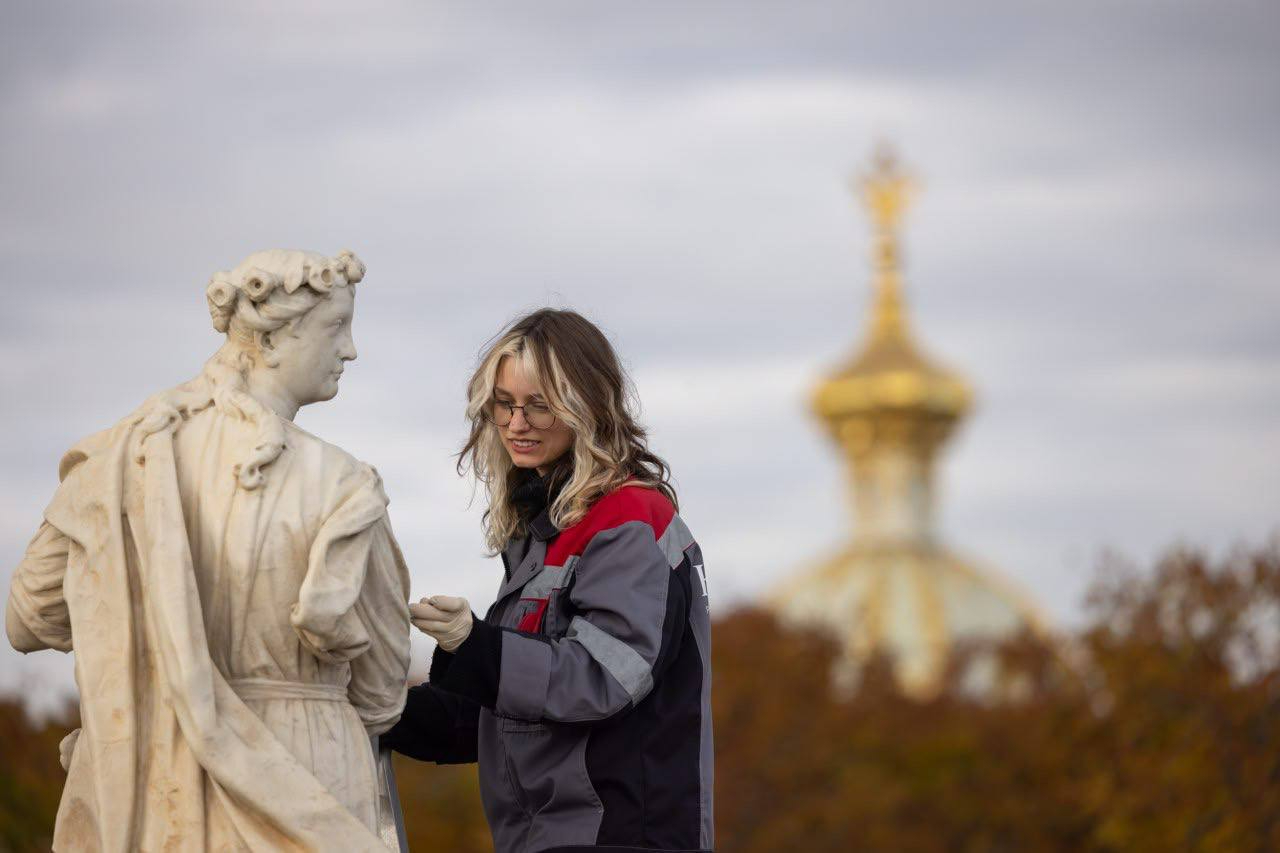 Ежегодно перед окончанием сезона проводится тщательная подготовка скульптурных композиций к предстоящей зимовке, рассказали в пресс-службе Государственного музея-заповедника «Петергоф».