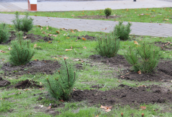 Для озеленения благоустроенной территории высадили хвойные растения: по 20 туй, горных сосен и можжевельников, дополнили их кленами, а также декоративными кустарниками — спиреей и сиренью. Все саженцы были получены из питомника и отличаются хорошим качеством.
