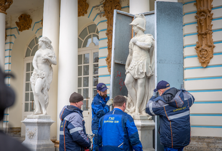 Более 60 статуй в Екатерининском и Александровском парках сотрудники музея-заповедника «Царское Село» облачают в «утепленные» футляры. В короба поместили фигуры китайцев на Большом китайском мосту, гальванопластическую коллекцию на Гранитной террасе и Рамповой аллее и знаменитую «Девушку с кувшином». В этом году на зиму укрыли также надгробия императорских лошадей в комплексе «Пенсионерная конюшня».