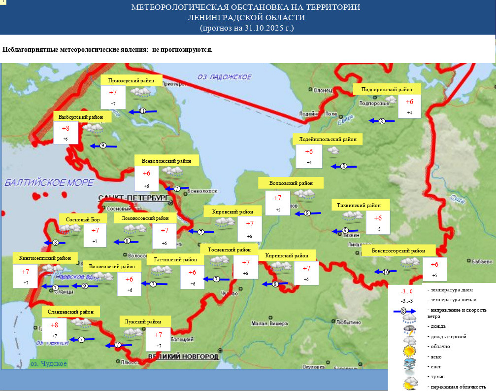 В пятницу, 31 октября, по прогнозу ФГБУ «Северо-Западное УГМС» в Ленобласти местами, преимущественно в западных районах, ночью пройдут умеренные дожди. Днем ожидаются небольшие дожди и морось.