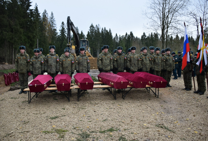 В деревне Захонье Волосовского района состоялась торжественно-траурная церемония перезахоронения останков жертв нацистского пересыльного концлагеря «Дулаг-102». С воинскими и гражданскими почестями были преданы земле останки 540 мирных жителей и военнопленных — женщин, мужчин и детей, зверски убитых фашистскими оккупантами в 1941-1943 годах. Это половина из тех, чьи останки были подняты поисковиками в ходе полевых работ 2023-2024 годов.