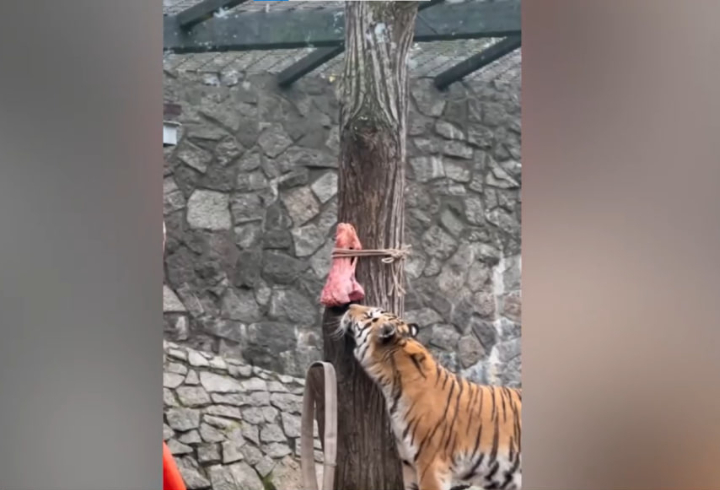 За неделю амурский тигр Амадей из Ленинградского зоопарка съедает почти 60 килограммов мяса. Сотрудники учреждения показали, как грациозный хищник с огромным аппетитом расправляется со своей порцией.