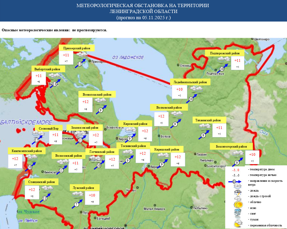 Как сообщает ФГБУ «Северо-Западное УГМС», в понедельник, 5 ноября, на территории Ленинградской области будет преобладать облачная погода местами с осадками в виде дождя. Прогнозируется юго-западный ветер скоростью 7-12 м/с, который на побережье может усиливаться до 15-17 м/с.