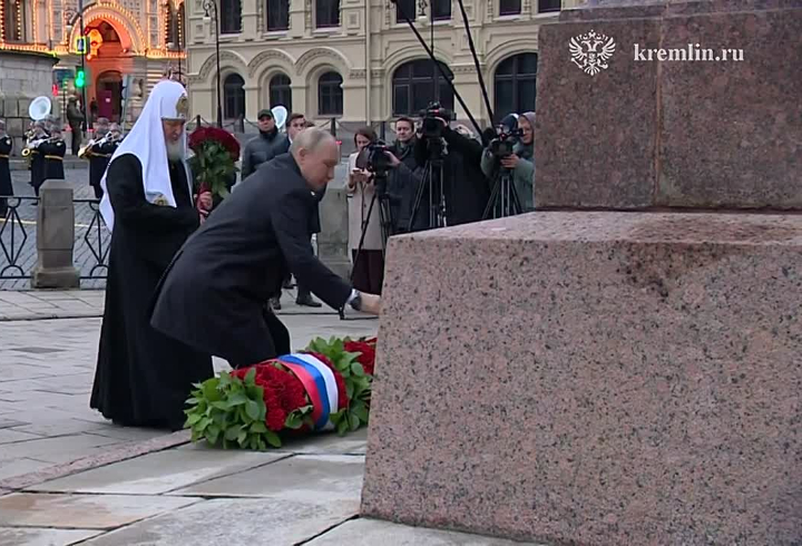 Сегодня, 4 ноября, в День народного единства Владимир Путин возложил цветы к памятнику Кузьме Минину и Дмитрию Пожарскому на Красной площади в Москве. В традиционной церемонии приняли участие представители конфессий, а также члены общественных и молодежных организаций.