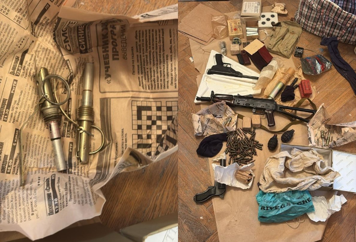 «В ходе выезда на место происшествия сотрудниками полиции были обнаружены и изъяты: две гранаты Ф-1 с заглушками, два запала, две тротиловые шашки по 200 граммов, электродетонатор, взрыватель, пять выстрелов к ракетнице, ракетница, пневматический пистолет, автомат АКСУ-74 выпуска 1991 года, сигнальный пистолет Шпагина, магазины к стрелковому оружию, более 170 патронов различного калибра.По результатам исследования, автомат АКСУ-74 признан боевым оружием, пригодным для стрельбы», - говорится в сообщении.