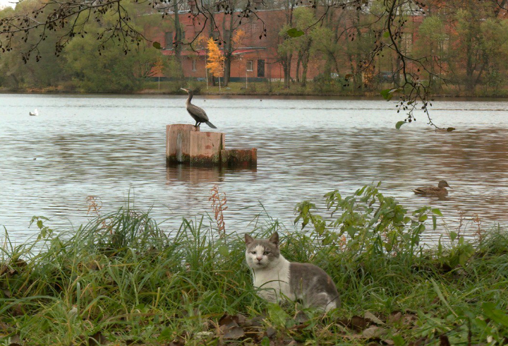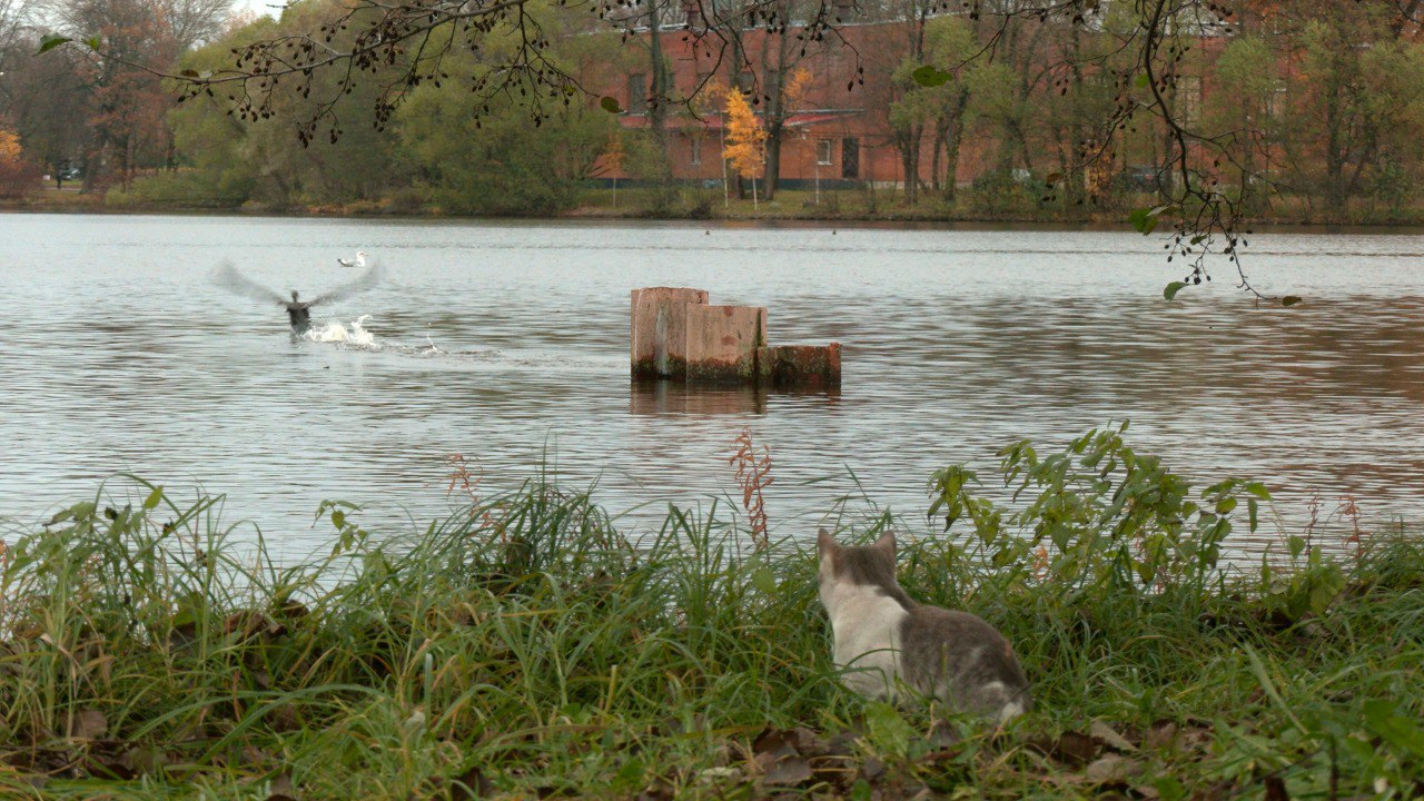 «Неудивительно, что таким красавцем заинтересовался местный кот. Баклан решил не испытывать судьбу, и, на всякий случай, убежал по воде — хоть и от домашнего, но все же хищника», — написал Глазков.