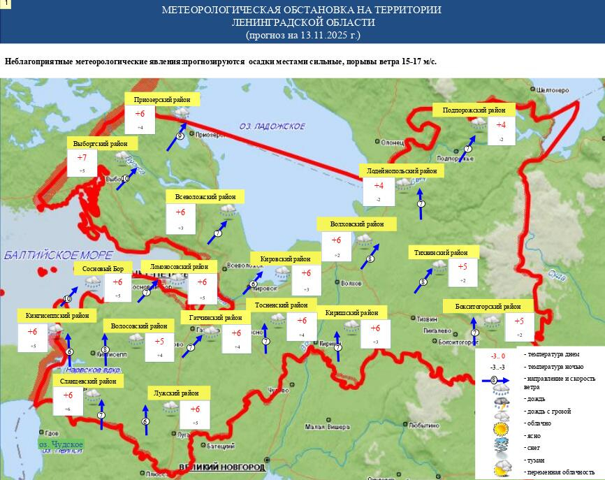 По прогнозу ФГБУ «Северо-Западное УГМС», в Ленинградской области 13 ноября ночью в большинстве районов ожидается небольшой и умеренный дождь. Днем осадки усилятся, местами пройдут сильные дожди. Ветер южный и юго-западный скоростью 7-12 м/с, с порывами до 15-17 м/с в отдельных районах.