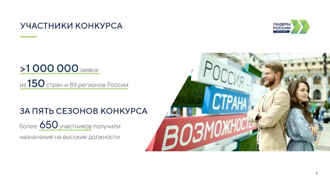 На сегодняшний день, как уточнил спикер, благодаря победе в конкурсе пять человек работают губернаторами, семь — первыми заместителями министров, два — сенаторами, 22 — депутатами Госдумы, а еще очень многие мэрами городов, включая административные центры, города-миллионики. Среди последних: Петр Конюшенко стал замминистра энергетики РФ, Андрей Чертков — председателем правительства ДНР, Сергей Жестянников — мэром Вологды, Олеся Старжинская — замгубернатора Ростовской области.