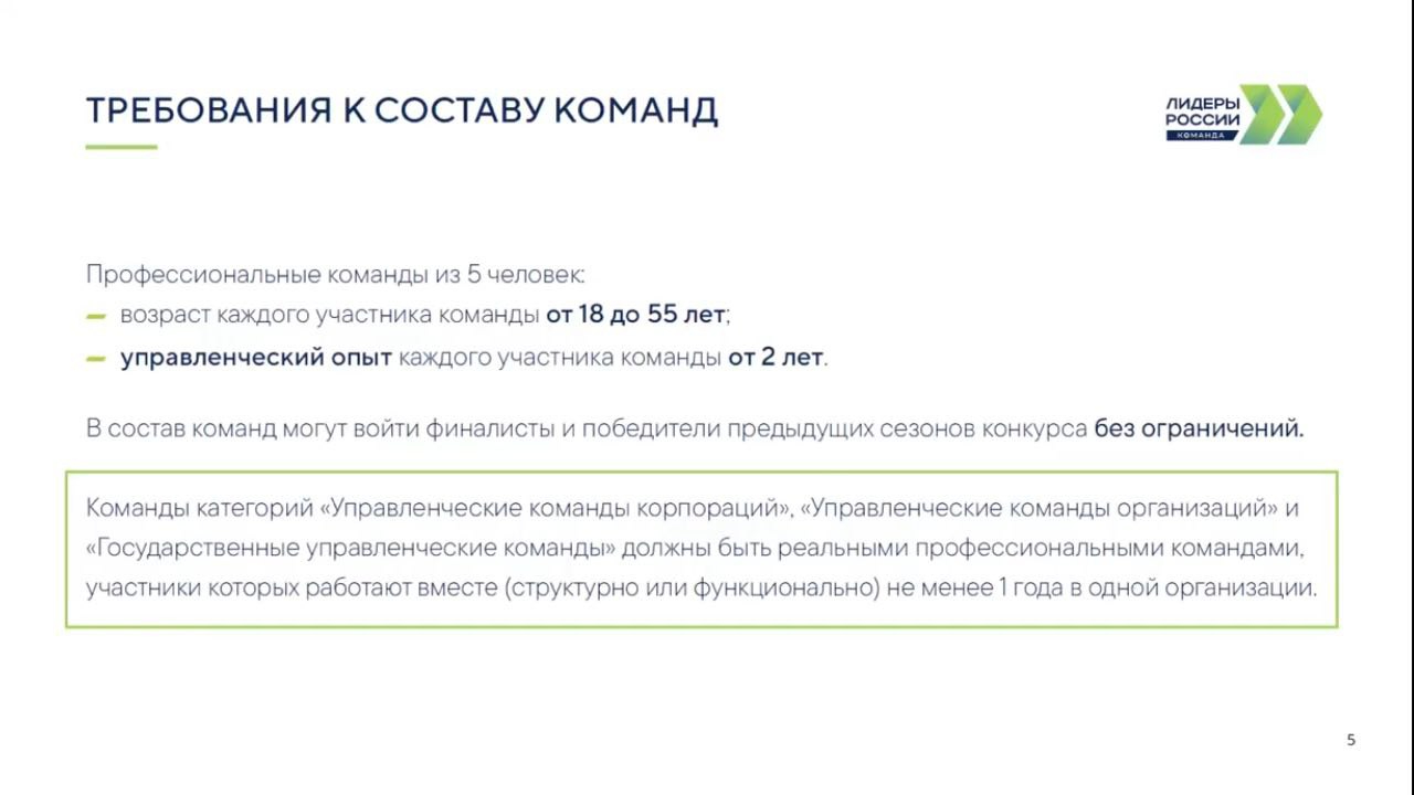 «Прежде оценивались люди, которые показывали высокую личную эффективность, интеллект, управленческие навыки, волю, энергию, способность добиваться поставленной цели, аналитические способности. Все это очень важно, но сегодняшний мир настолько сложен, что почти нет серьезных задач, которые можно решить в одиночку, — объяснил Сергей Кириенко. — Коллективная командная работа — это то, что свойственно российским традиционным ценностям. Поэтому в этом сезоне соревноваться будут не отдельно взятые личности, а команды по пять человек, связанных совместной деятельностью».