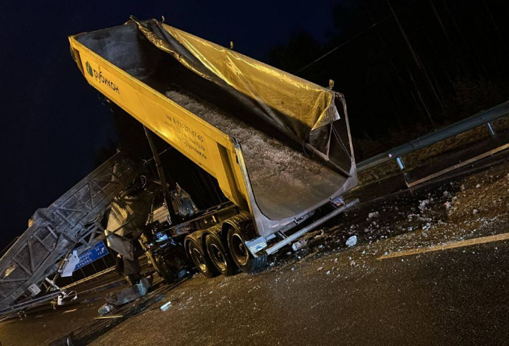Утром 16 ноября в социальных сетях появились снимки, сделанные после ДТП с участием грузовика-тонара на трассе А-121 «Сортавала». По предварительной информации, водитель грузового автомобиля забыл опустить кузов и сбил рамную металлическую опору для дорожных знаков. Опора рухнула на обе полосы встречного движения.