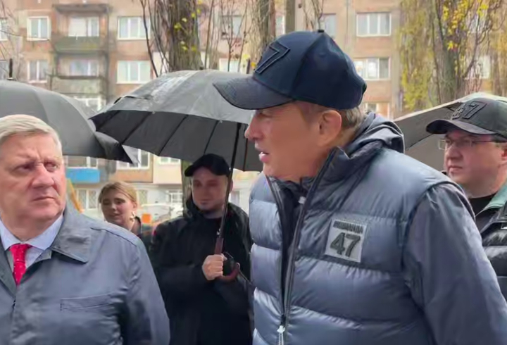 Губернатор Ленобласти Александр Дрозденко во время рабочей поездки в Енакиево посетил улицу Брайляна, где ленинградские специалисты восстанавливали поврежденный обстрелами ВСУ подъезд.