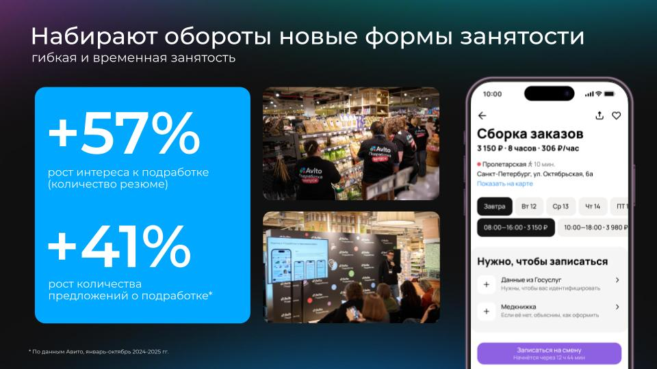 Параллельно развивается сегмент временной и гибкой занятости: количество предложений о подработке увеличилось на 41%, интерес соискателей — на 57%. Расширение этого направления связано как с запросом на более гибкий график, так и с желанием работников диверсифицировать источники дохода.