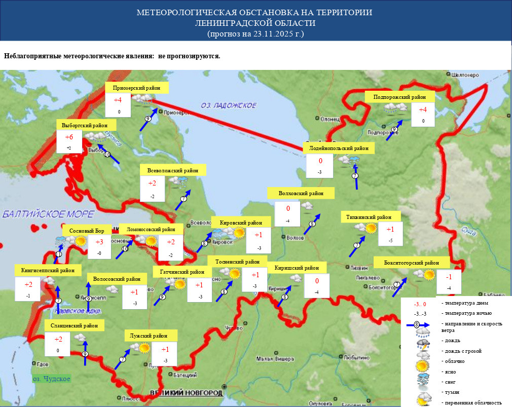 Как сообщают синоптики ФГБУ «Северо-Западное УГМС», 23 ноября на территории Ленинградской области ожидается переменная облачность. Ночью и в течение дня прогнозируется небольшой снег. На дорогах сохранится гололедица.