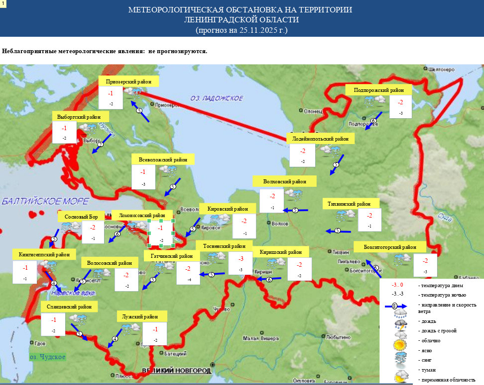 В Ленинградской области в этот вторник, 25 ноября, будет облачно. В большинстве районов пройдет небольшой, местами умеренный снег или мокрый снег. Местами ожидается налипание мокрого снега, сообщает региональное МЧС.