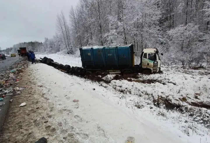 25 ноября в 10:59 на трассе А-180 произошло дорожно-транспортное происшествие с участием грузового мусоровоза. Водитель не справился с управлением и съехал в кювет, после чего прицеп опрокинулся на бок.