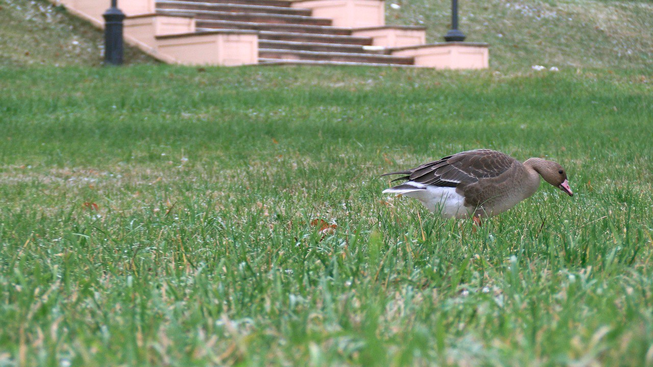 Молодой белолобый гусь, отставший от стаи, выбрал для передышки живописную территорию музея-заповедника «Парк Монрепо» в Выборге.