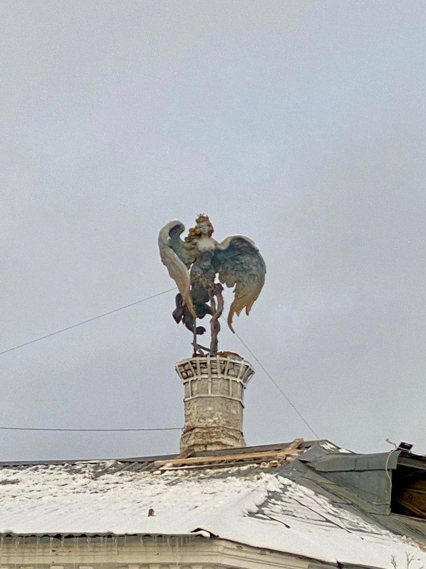 В Тихвине на крыше бывшего особняка Воложбенских, где ныне расположены Школа кино и телевидения «Лантан» и радио «Тихвин», поселилась мифическая райская птица Алконост.