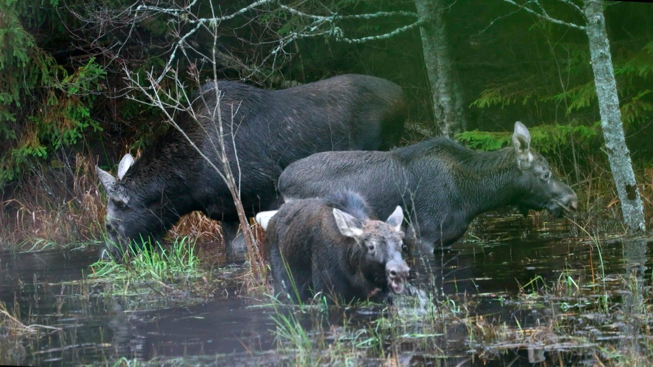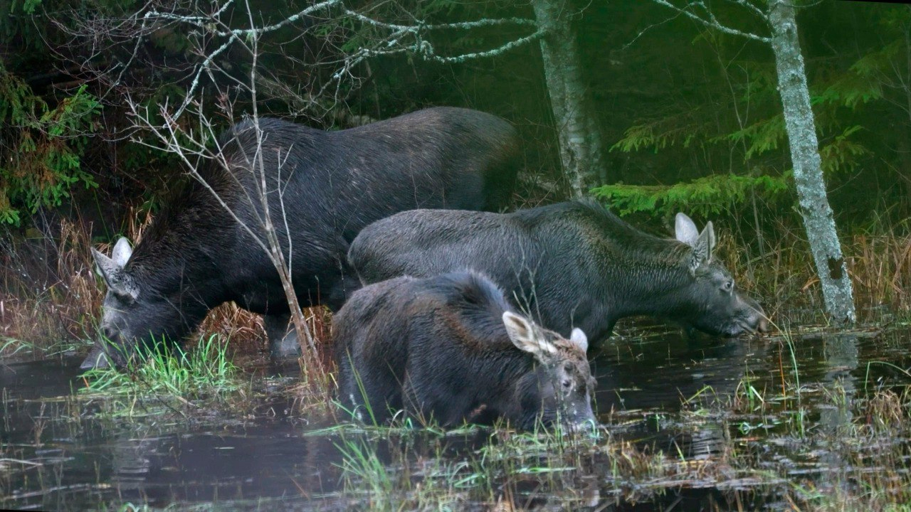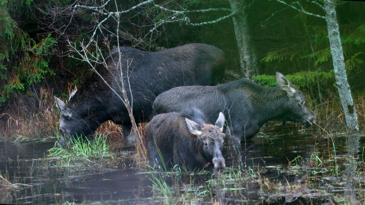 Семейная группа — лосиха с уже почти взрослыми телятами — спешит полакомиться сочными подводными растениями, одним из своих любимых угощений. Этот редкий для зимы момент удалось запечатлеть фотографу Анатолию Смирнову.