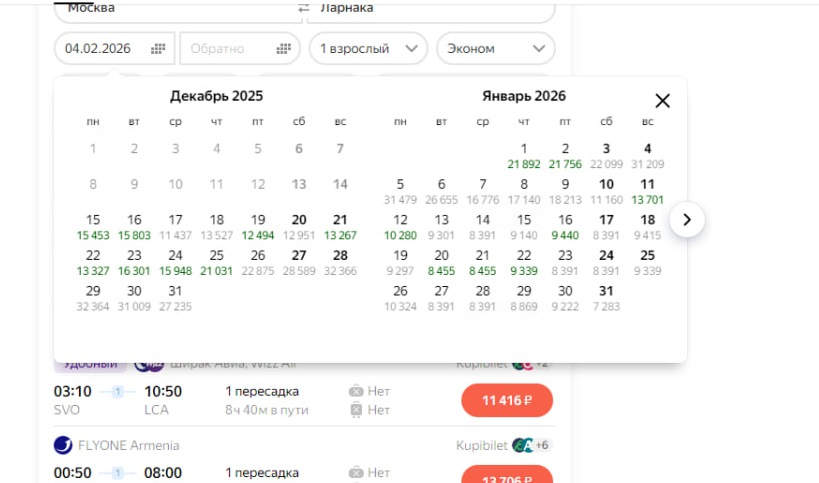 Из Москвы до города Лимассол перелеты в последние дни декабря обойдутся в среднем в 22-32 тысячи рублей на человека. В первых числа января перелет будет стоить примерно также. А вот уже 7-8 января купить билеты можно дешевле – примерно за 11-16 тысяч рублей. А после новогодних праздников цены упадут еще ниже – до 8-10 тысяч рублей. Все рейсы с одной пересадкой.