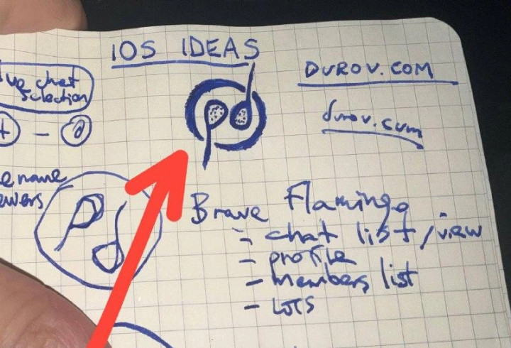 Помимо этого, на листочке также можно заметить не только наброски логотипа, но и (по всей видимости, шуточный) домен durov.cum.