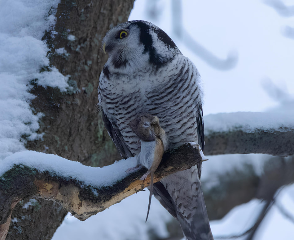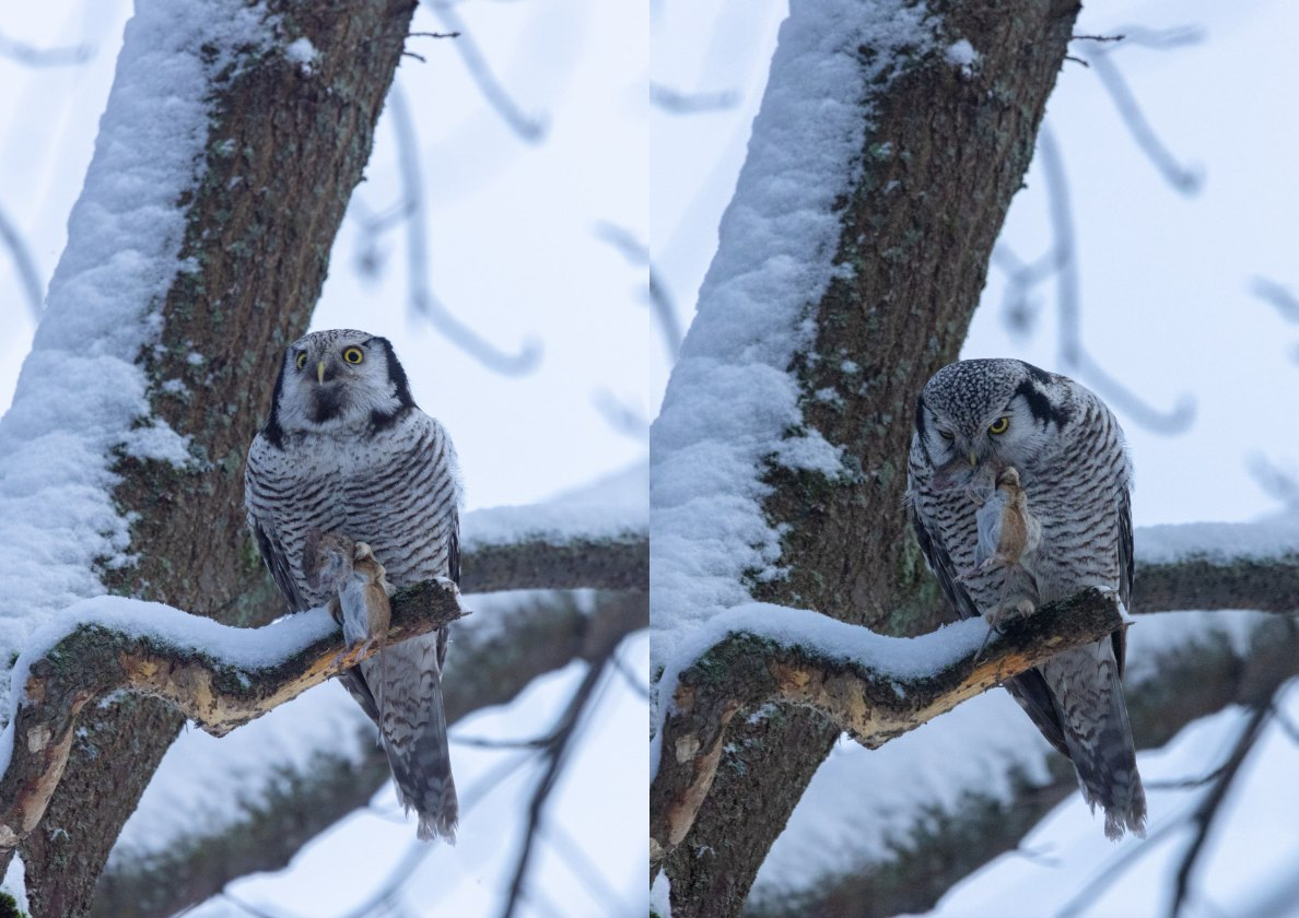 Накануне, 29 декабря, в Санкт-Петербурге после снегопада в одном из парков наблюдали ястребиную сову. Птицу заметили во время кормления. После непродолжительной трапезы сова улетела, спрятав добычу в развилке березы.