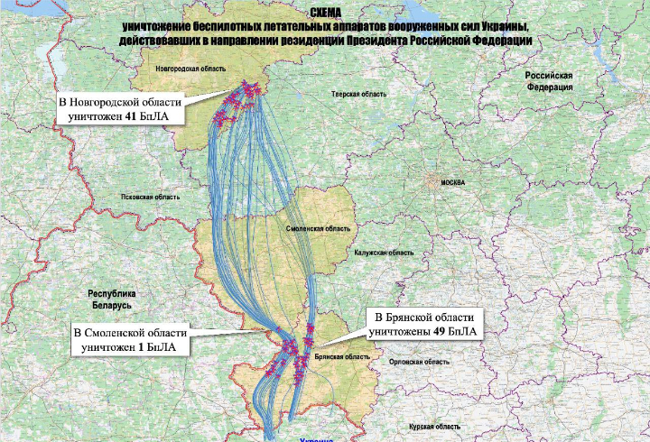 Резиденцию главы государства пытался атаковать 91 дрон. 41 беспилотник сбили в самой Новгородской области, 49 в Брянской, еще один — в Смоленской области.