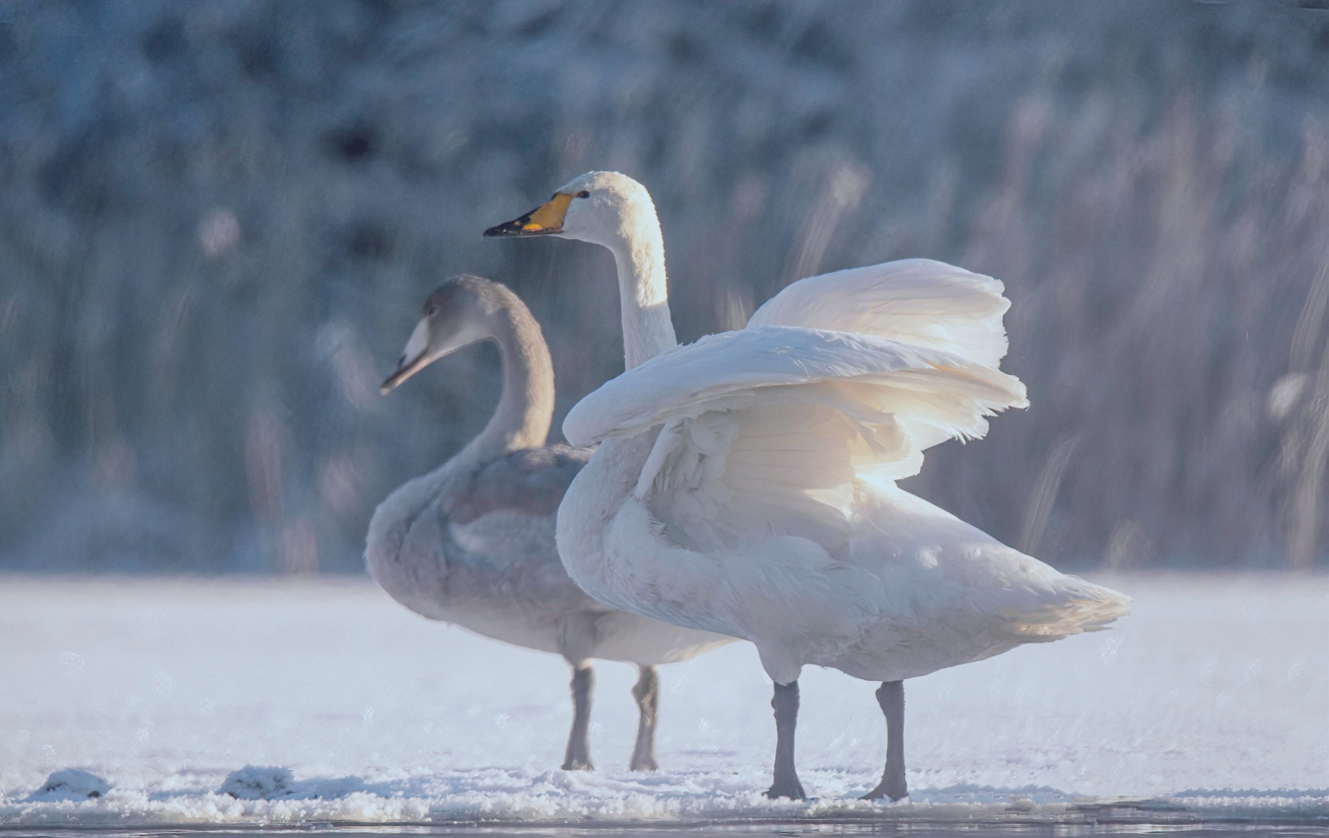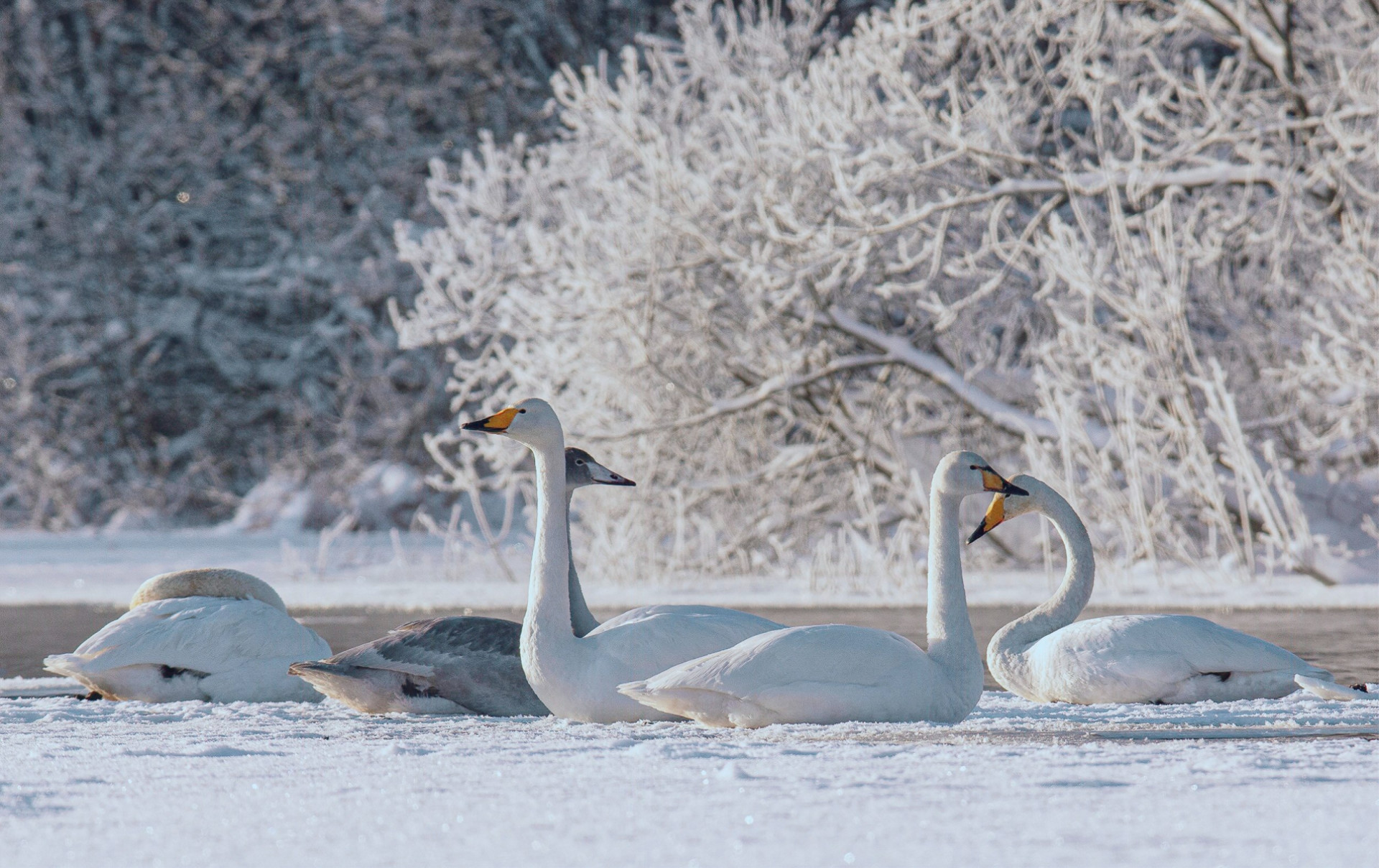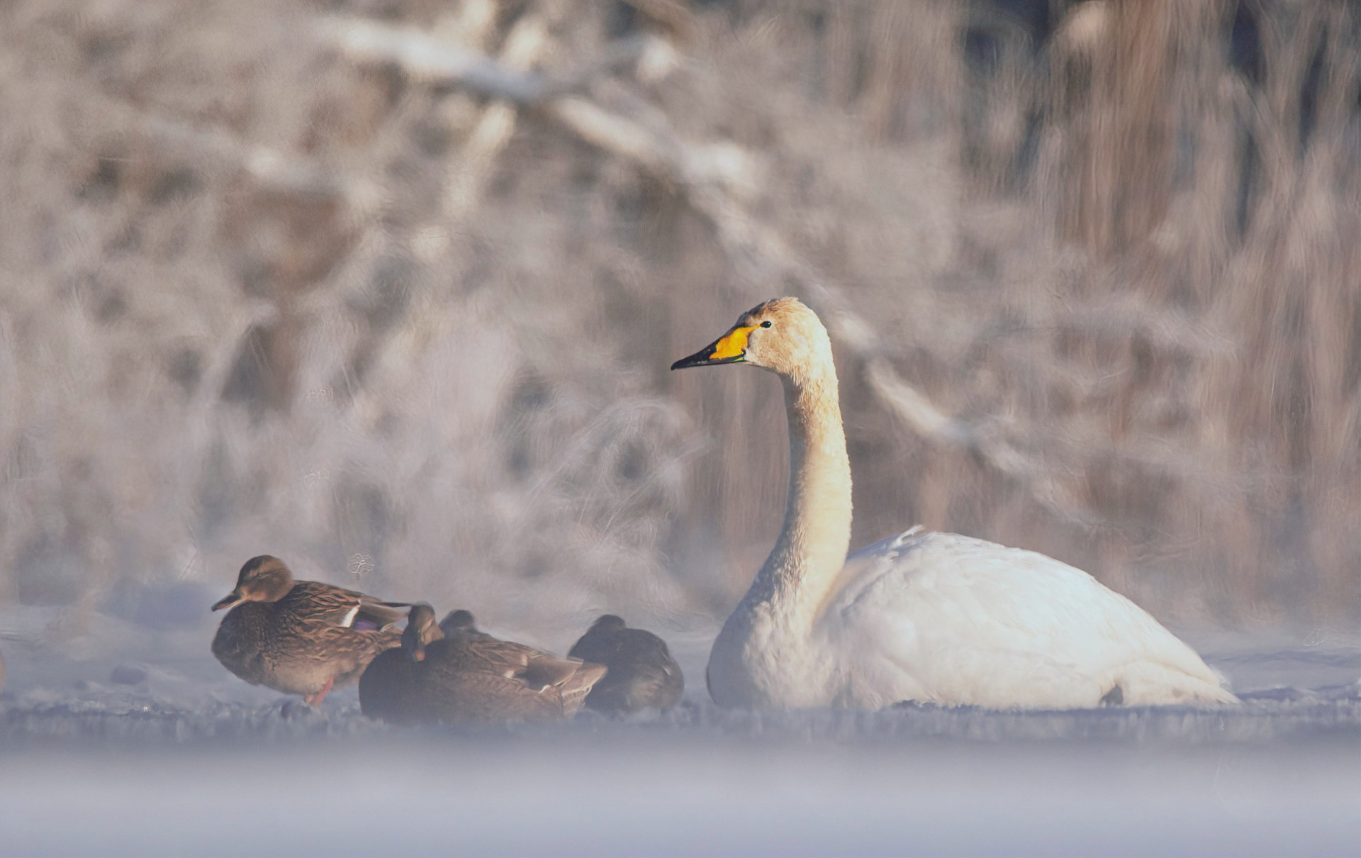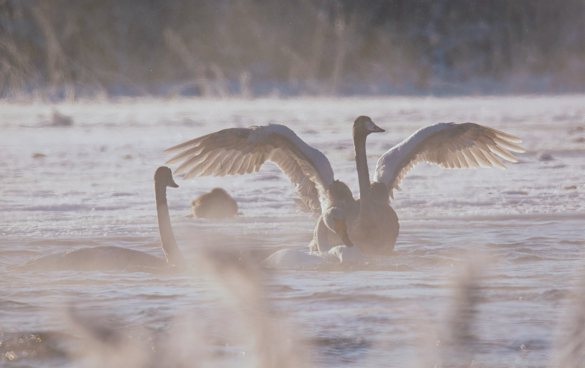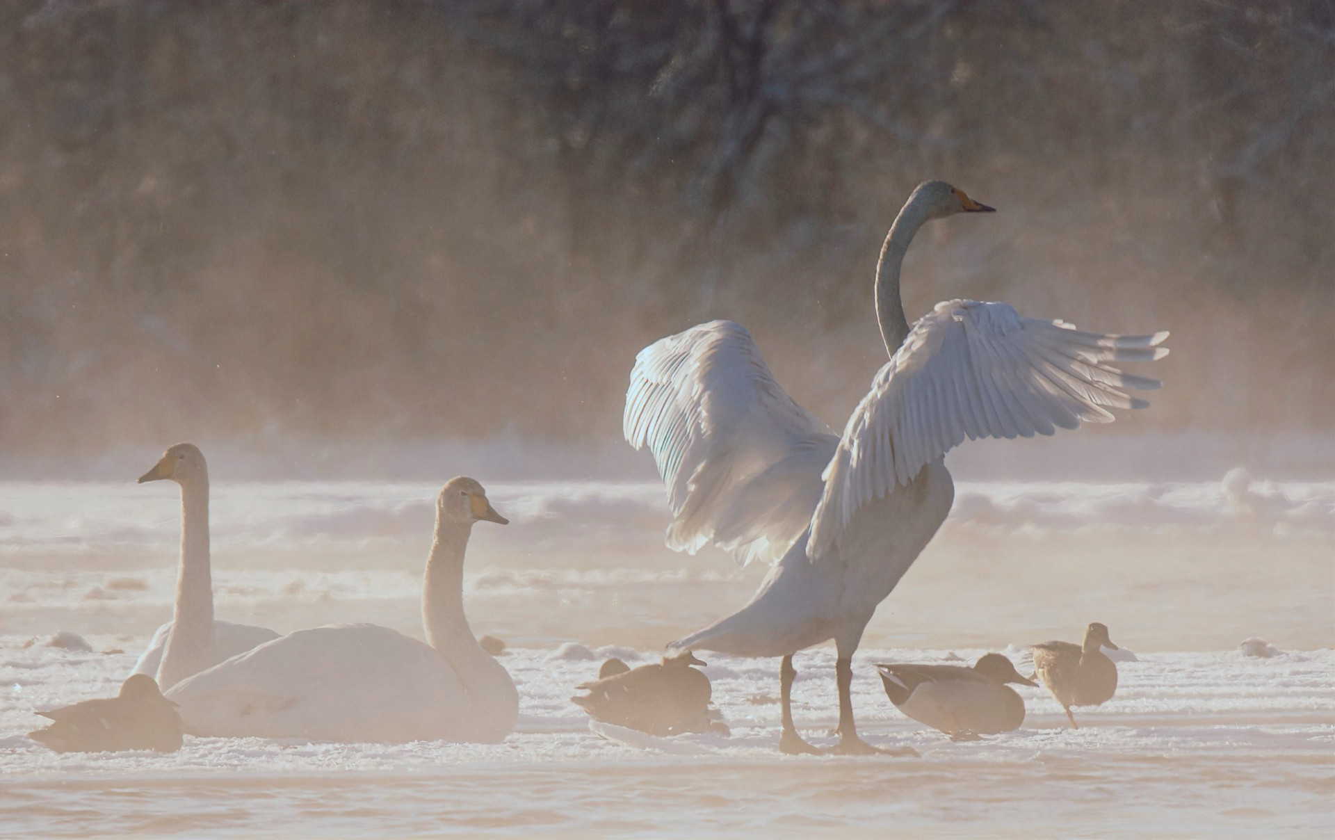 «Мороз и солнце, день чудесный. С воды поднимается пар и сквозь него можно разглядеть стаю лебедей. Это лебеди кликуны», - подписал автор.