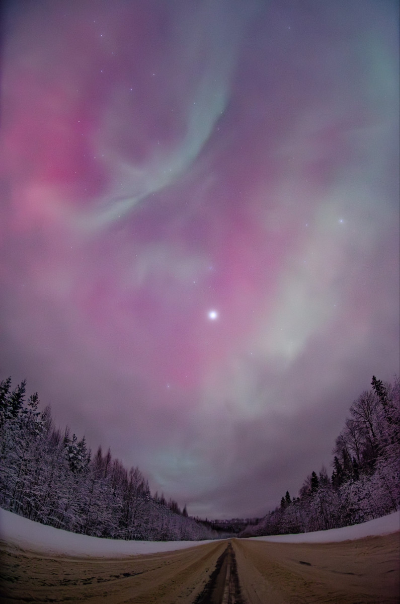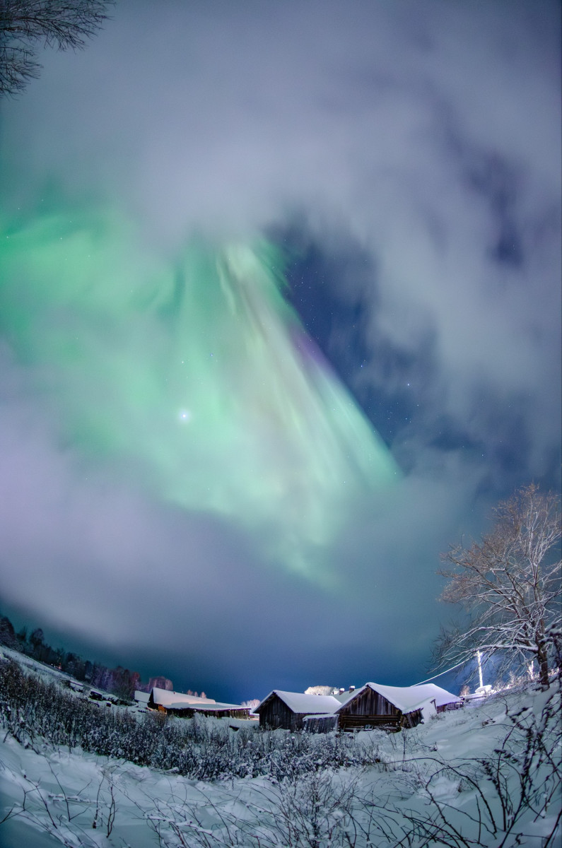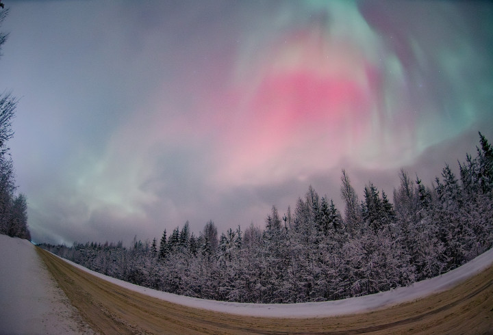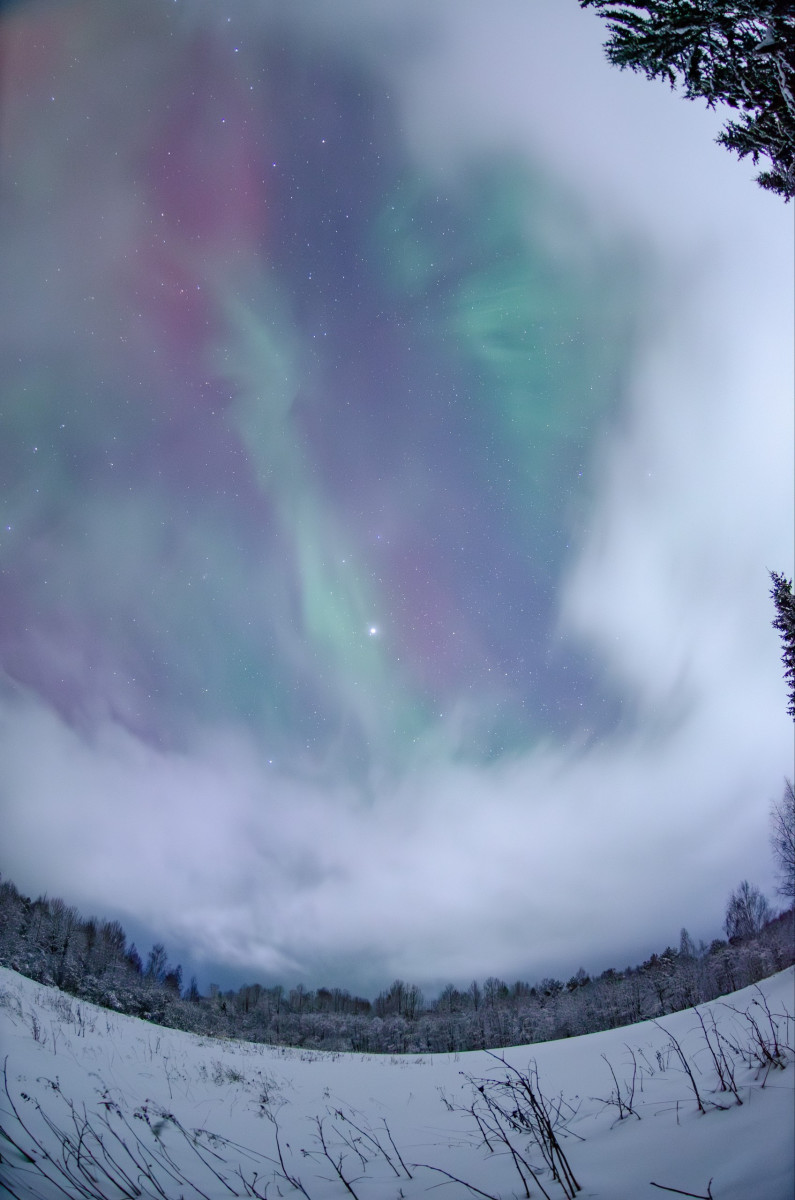 В телеграм-канале «АстроФотоБолото» появились впечатляющие кадры северного сияния, заснятые в Подпорожье 21 января. Несмотря на облачность, полярное сияние выглядело ярко и захватывающе, окрашивая ночное небо в зелёные, фиолетовые и розовые оттенки.