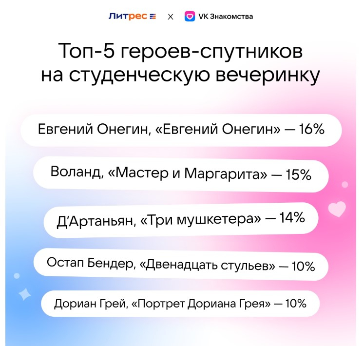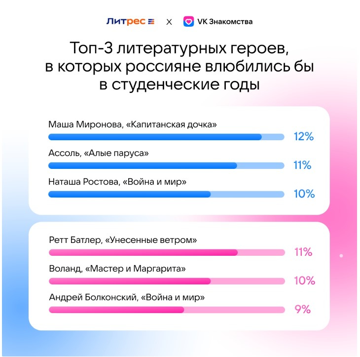 Респонденты также рассказали, в каких литературных персонажей могли бы влюбиться в студенчестве. Среди мужчин лидирует Маша Миронова из «Капитанской дочки» (12%), затем Ассоль (11%) и Наташа Ростова (10%). Среди женщин на первом месте оказался Ретт Батлер (11%), далее Воланд (10%) и Андрей Болконский (9%).