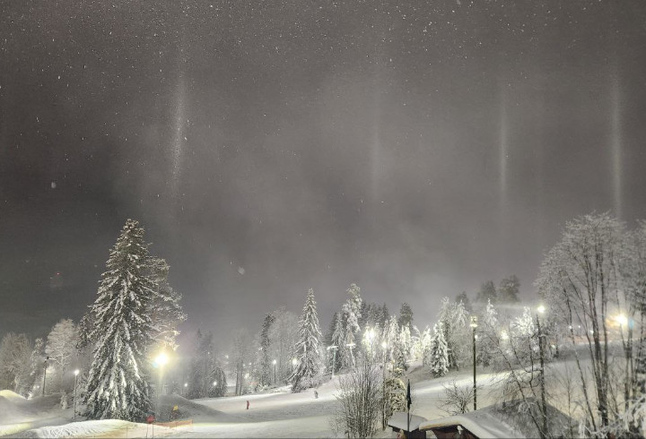 Световые столбы возникают, когда искусственный или естественный источник света отражается от мельчайших ледяных кристаллов в воздухе. Обычно их можно увидеть в холодную, ясную ночь при низкой температуре и спокойной погоде. Столбы света могут подниматься вверх над источником, создавая впечатление светящейся колонны. В данном случае эффект был вызван уличными огнями курорта и снегом на морозе.