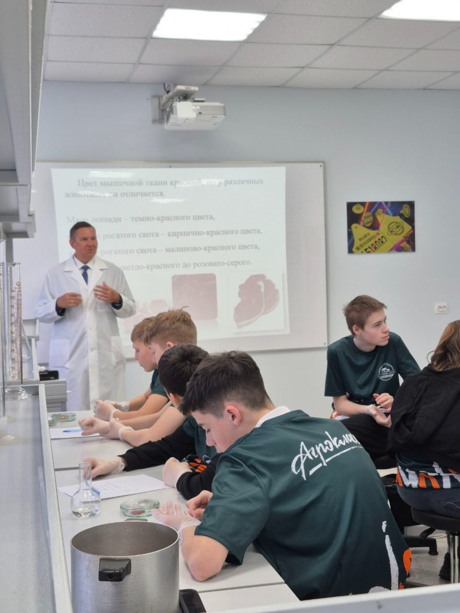 Занятие организовал Институт животноводства и аквакультуры имени В. И. Наумова. Школьники наблюдали, как специалисты проводят профессиональный анализ мясной продукции, работали с оборудованием для определения качества мяса, изучали современные методы подготовки образцов и осваивали критерии определения вида и качества продукции.