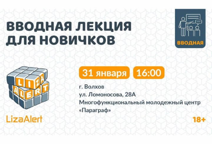Поисково-спасательный отряд «ЛизаАлерт» проведет 31 января вводную лекцию для желающих стать добровольцами. Встреча состоится в Волхове в многофункциональном молодежном центре «Параграф» на улице Ломоносова, 28А. Начало в 16:00.