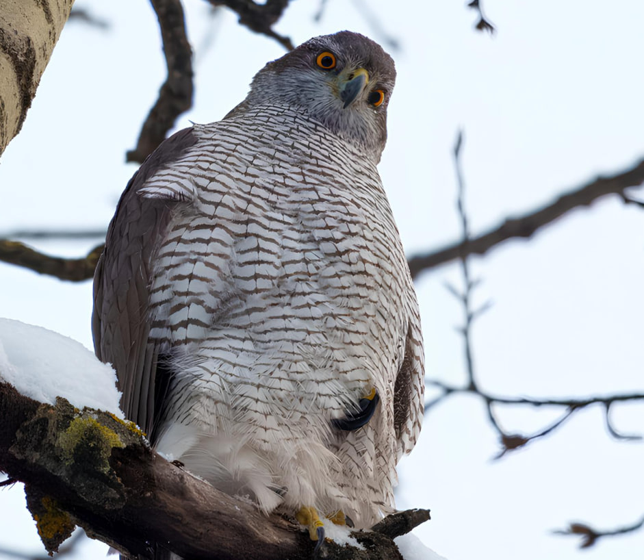 В Невском районе Петербурга фотографу Станиславу Крутоверцеву посчастливилось сделать уникальный кадр: ястреб-тетеревятник, укрывшись от стужи, поджал лапу, чтобы согреться.