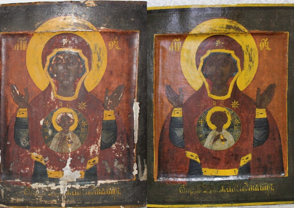 Эксперты установили, что икона «Знамение» была создана в XVII веке, что на столетие старше предыдущей датировки. Надпись, проявившаяся в процессе исследования, показала, что на нем изображен не Сергий Радонежский, а преподобный Антоний Дымский.